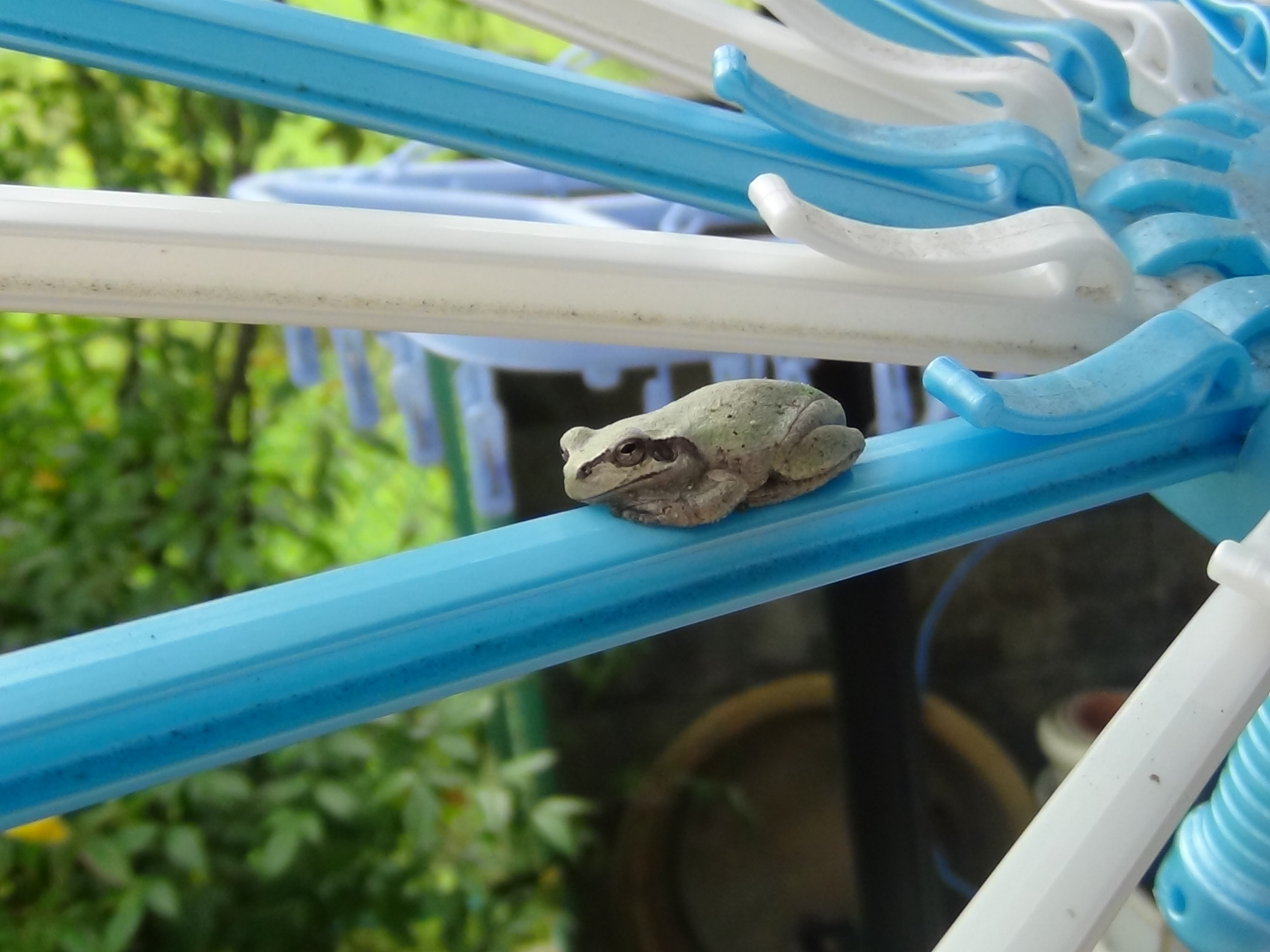 今朝、洗濯物を干そうとしたらこんな所でカエルが休憩していました。