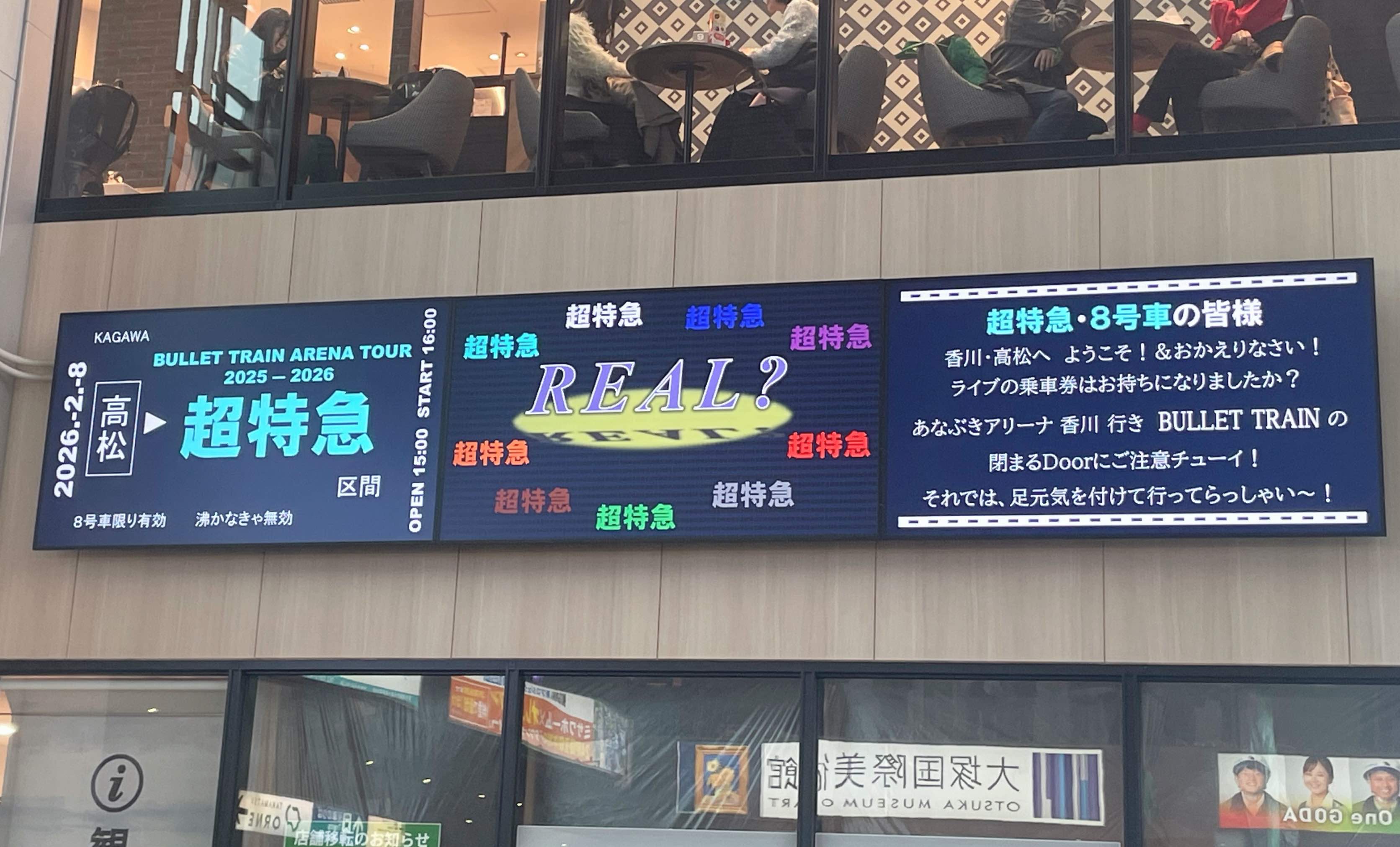 この日は、高松駅の液晶掲示板や、おみやげ屋さんなども超特急仕様になっていて、ライブ前からワクワクでした♪